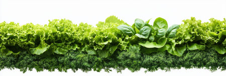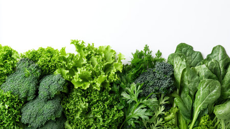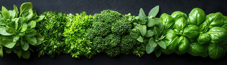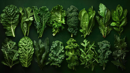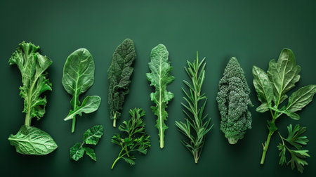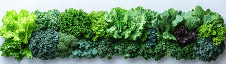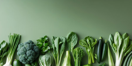 AI Generated. Fresh Green Leafy Vegetables in a Row on a Bright Green Background for Healthy Eating and Nutrition Concepts