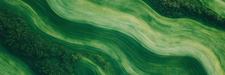 Stunning aerial view showcasing vibrant green fields with captivating winding patterns under bright sunlight, highlighting the beauty of agricultural landscapes.