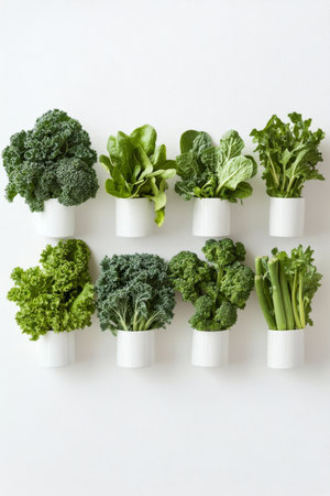 Various types of fresh green vegetables are lined up in sleek white containers against a light background, showing their vibrant colors and textures, promoting healthy eating.