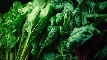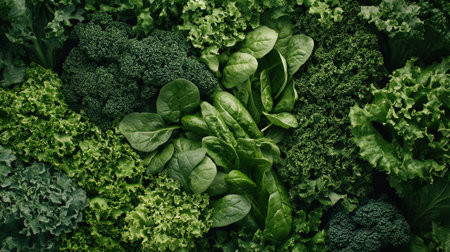 A closeup view of fresh green leafy vegetables, highlighting the vibrant textures and colors of spinach and other greens, perfect for promoting healthy eating choices.