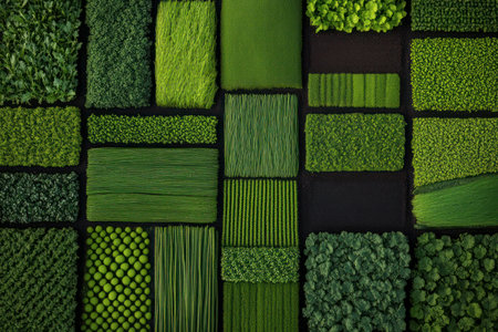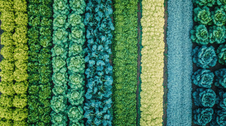 This aerial photograph showcases vibrant green rows of diverse crops, emphasizing the beauty of agricultural landscapes and the harmony of nature.
