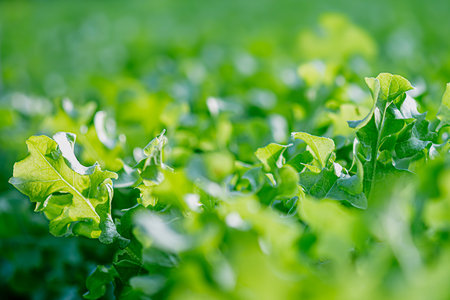 Closeup of fresh green lettuce growing in vegetable garden. Selective focus.