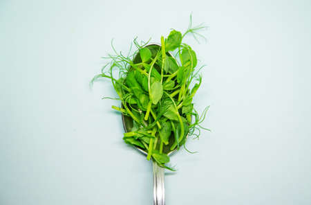 Dill parsley mangold micro greens scallions on blue background. Nourishing greens rich in vitamin, antioxidants, fibre