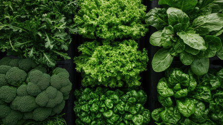A stunning array of fresh leafy greens including spinach, kale, and lettuce. Perfect for promoting a healthy diet, cooking, and vibrant meals.