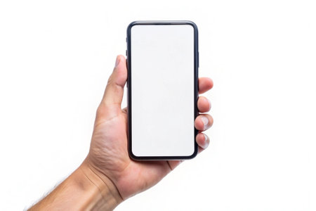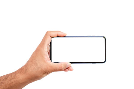 Hand holding smartphone with blank screen isolated on white background, clipping path