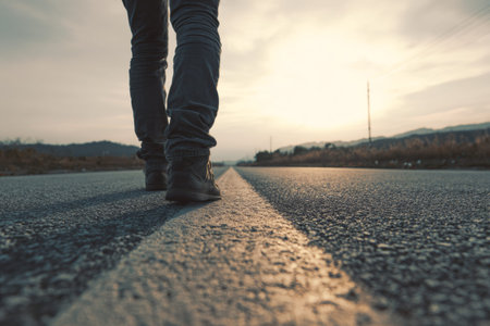 An asphalt road extends into the distance, framed by hills and illuminated by a setting sun. The composition features a low-angle perspective, highlighting the road's texture and the natural gradient of the sky. The warm colors suggest a tranquil outdoor setting, suitable for commercial or editorial applications.