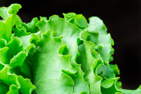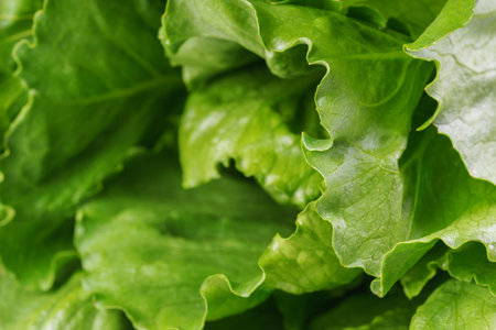 Detailed macro shot of fresh green lettuce leaves with crisp texture. Vibrant and healthy vegetables ideal for salads, cooking, or vegetarian themes. Food background, wallpaper, backdrop