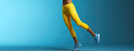 Close-up of a pair of colorful sneakers and denim legs against a bright, pastel-colored wall, with copy space for text.