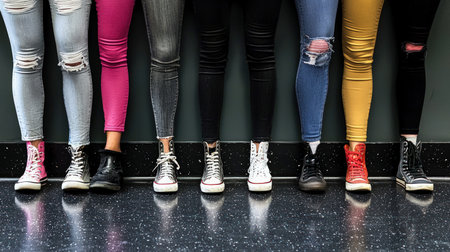 A pair of denim-clad legs with colorful sneakers are positioned against a pastel-colored wall, creating a vibrant and youthful fashion image.