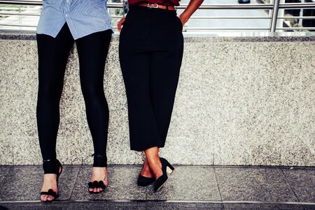 Legs of various young stylish people sitting on chairs in hallway and waiting their turn. Five unknown male and female clients or candidates are dressed in stylish casual clothes and shoes. Banner.