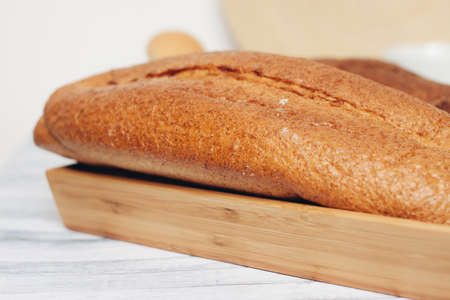 Fresh delicious bread close-up. Freshly baked sourdough bread with a golden crust on a wooden board. The context of a bakery with delicious bread. confectionery products.