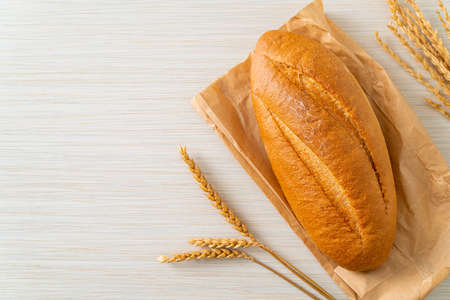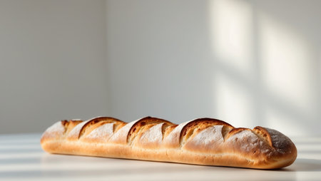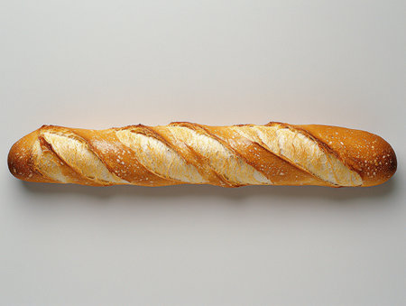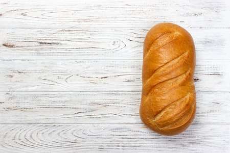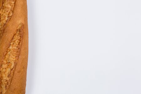 one loaf of french homemade brown and orange bright baguette bread put horizontaly on lower part of white empty background Top view shot with copy space