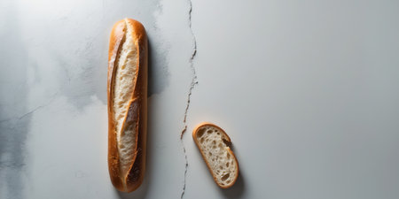 Freshly baked whole French bread loaf isolated on white background in flat lay composition. Vertical format with room for text.
