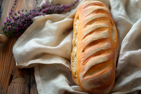 Bread on a wooden table with a gray gauze tablecloth, fresh baguette on wooden background