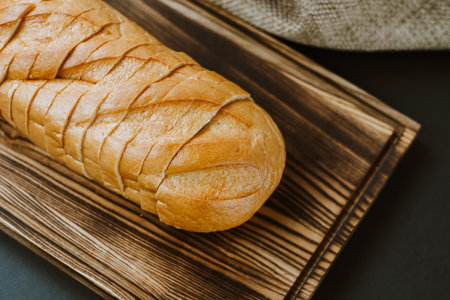 Wheat bread, sliced long loaf on a wooden board. Black background, top view with copy space. High quality photo.
