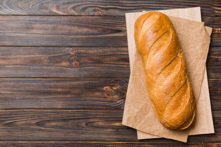 Fresh bread baguette on wooden table. Top view with space for your text