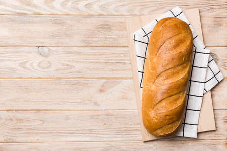 freshly baked bread with napkin on rustic table top view. Healthy white bread loaf isolated.