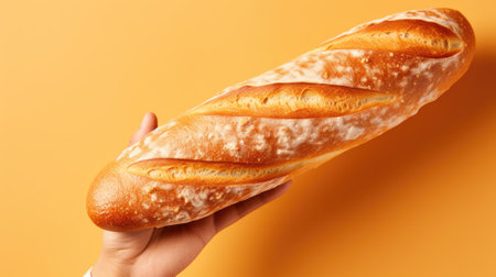 Minimalist french baguette on colored background. fresh bread as background, top view with space for your text or design.
