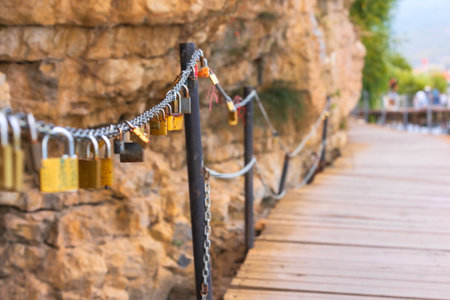 Ohrid, North Macedonia, Padlocks on the Bridge of Wishes, coast pathway to the church