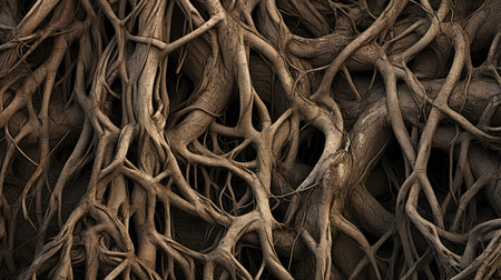 Unearth family ties with this captivating artwork depicting intertwined tree roots Symbolizing shared history, it's ideal for genealogy or personal reflection Discover interwoven stories and a powerful visual of heritage Intricate details reveal a strong foundation, perfect for presentations, websites, or as a decorative piece honoring ancestry AI Generative