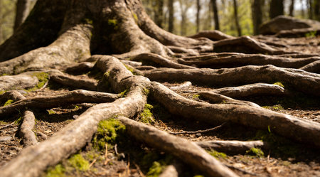 Detailed shot of natural tree roots beneath soil surface. Symbol of stability, growth, and natural support systems.