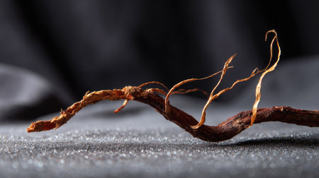 A brittle, curled branch from a dead tree sitting still on dark velvet surface, simple and elegant