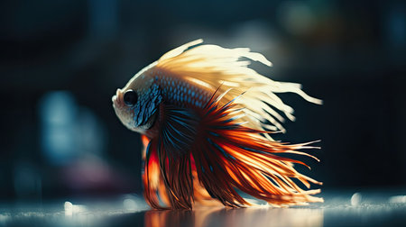 High-resolution close-up of a Betta fish with a striking color contrast against a minimalist, dark-colored aquarium background that highlights its beauty.