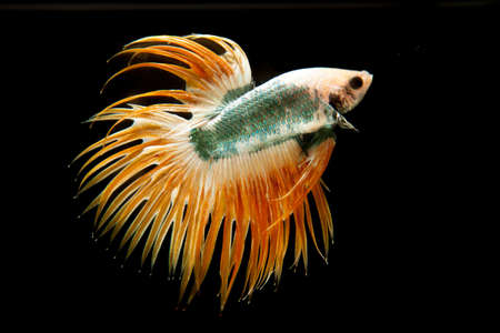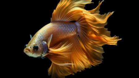 Capture the moving moment of yellow siamese fighting fish isolated on black background. Betta fish.