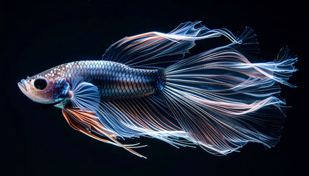 A stunning Siamese fighting fish glides through the deep, its iridescent blue fins trailing like silk ribbons in the water. Isolated against a stark black background, its vibrant colors and graceful movement create a sense of serene and mysterious beauty, a living jewel in the darkness.