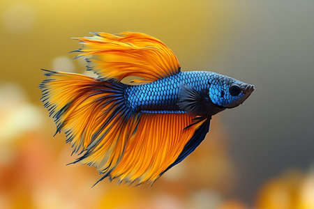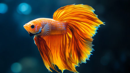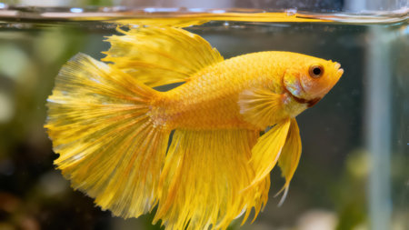Striking shot of a golden betta fish in its transparent aquarium enclosure.