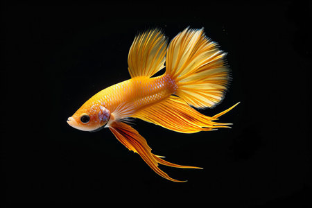 betta fish with yellow fluffy fins on black background