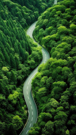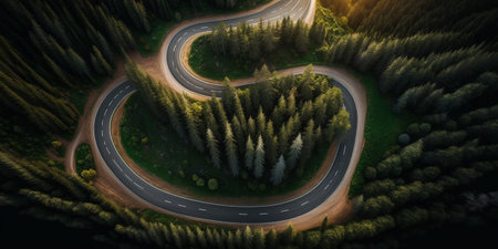 Aerial view of a winding road cutting through a dense green forest in the mountains. Generative AI