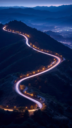 Curvy mountain road with trailing lights at night, Aerial view of mesmerizing nocturnal landscape. Ai Generated