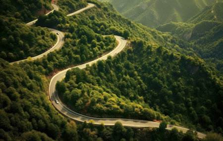winding mountain road as it snakes through rugged terrain, offering a bird's-eye view of the challenging twists and turns.