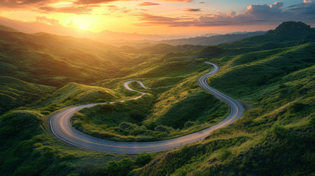 A winding asphalt road curves through vibrant green rolling hills and meadows, bathed in the warm golden light of a sunset sky.