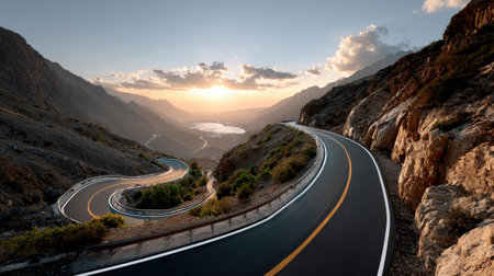 The winding highway ss through the silhouette of distant mountaintops casting long shadows across the landscape. The last rays of . AI generation