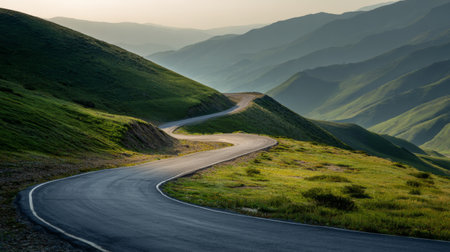 Experience the tranquility of a winding road embraced by lush green hills and majestic mountains under soft evening light, perfect for journeys into nature.