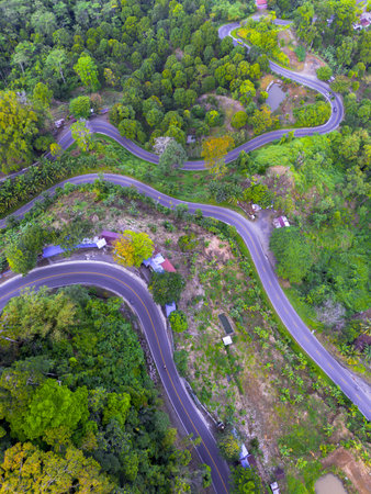 Aerial view of winding road in the green forest, Thailand.