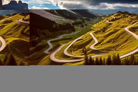 scenic road trip through the mountains, with winding roads and lush greenery, created with generative ai
