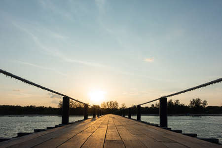 Wooden bridge sea in sunset. Sunlight and sun in evening.