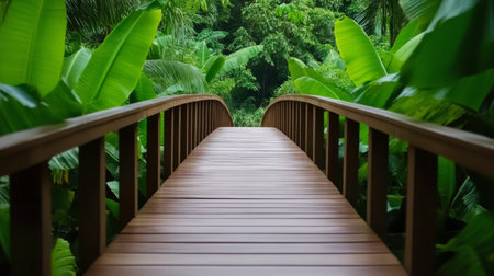 A wooden bridge extends over vibrant green foliage in a tropical forest. Sunlight filters through large leaves, creating a serene atmosphere perfect for nature exploration.