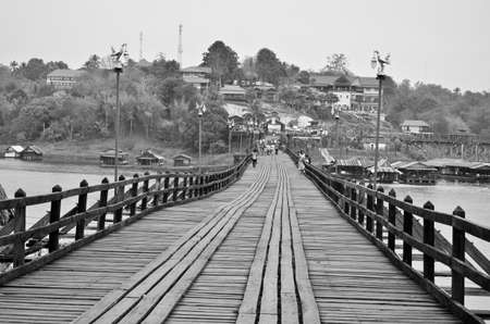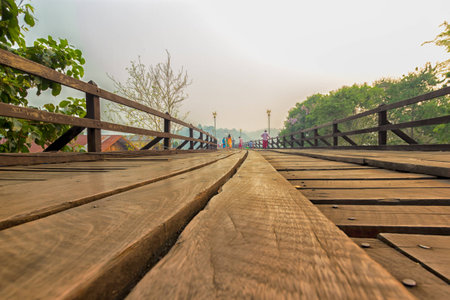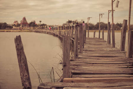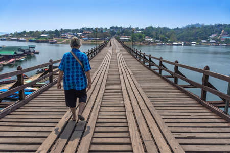 Mon Bridge or Uttamanusorn Bridge in Sangkhla Buri, Kanchanaburi, Thailand. The second longest wood bridge in the world after the Mandalay's U Bein Bridge in Myanmar.