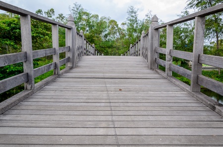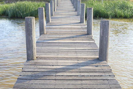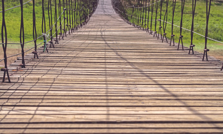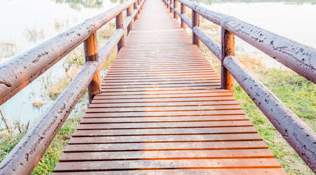 wooden bridge footbridge walkway pathway along rice paddy field in Thailand