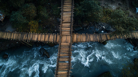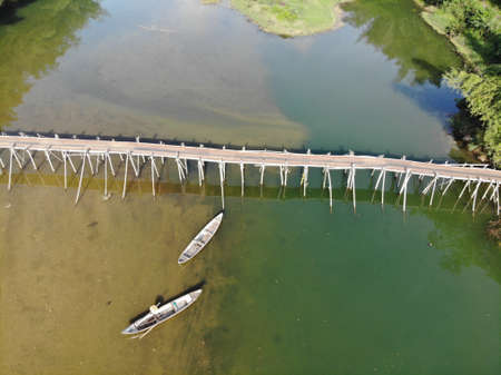 Aerial view of wooden bridge over the mountain river in Thailand.