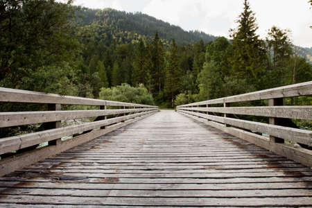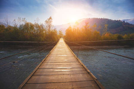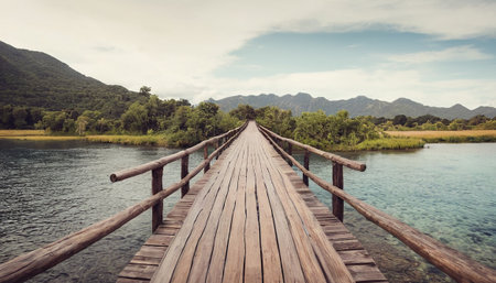 The wooden bridge stretches across the river overlooking the mountains and the beautiful sky