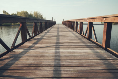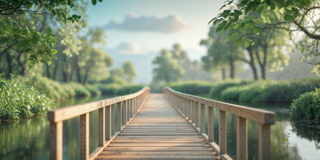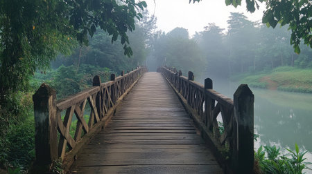 A serene morning shot of a wooden pedestrian bridge over a calm river, surrounded by lush greenery and mist, capturing the tranquility of the setting.