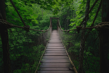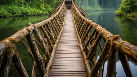 A peaceful wooden bridge stretches through a vibrant green forest, inviting exploration and adventure amid lush foliage and serene surroundings.