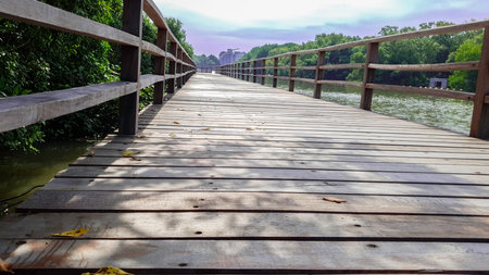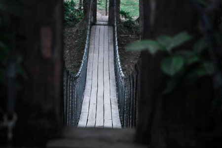 Wooden bridge with green trees forest.Natural background.View of copy space.Khao yai nation park,Thailand.