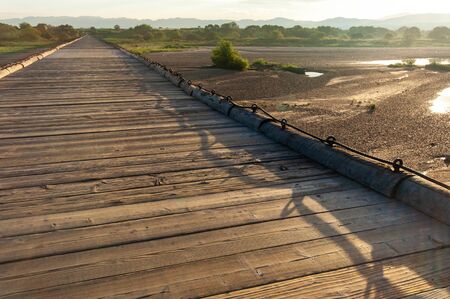 Mon Bridge, The longest wooden bridge in Thailand in evening.