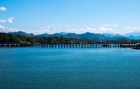 The longest wooden bridge of Thailand (Mon Bridge) across the Songkhalia river in Sangkhlaburi, Kanchanaburi, Thailand.